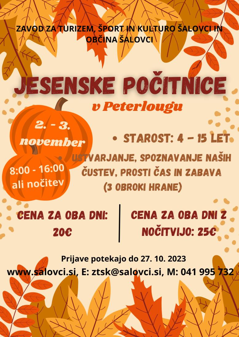 Zavod za turizem, šport in kulturo Šalovci ter Občina Šalovci pripravljata 2-dnevne aktivnosti v času letošnjih krompirjevih počitnic za otroke, stare od 4 do 15 let. Delavnice bodo potekale v četrtek, 2. in v petek, 3. novembra 2023 od 8:00 do 16:00 v TNC Peterloug v Markovcih. Otroci imajo možnost tudi prespati.
