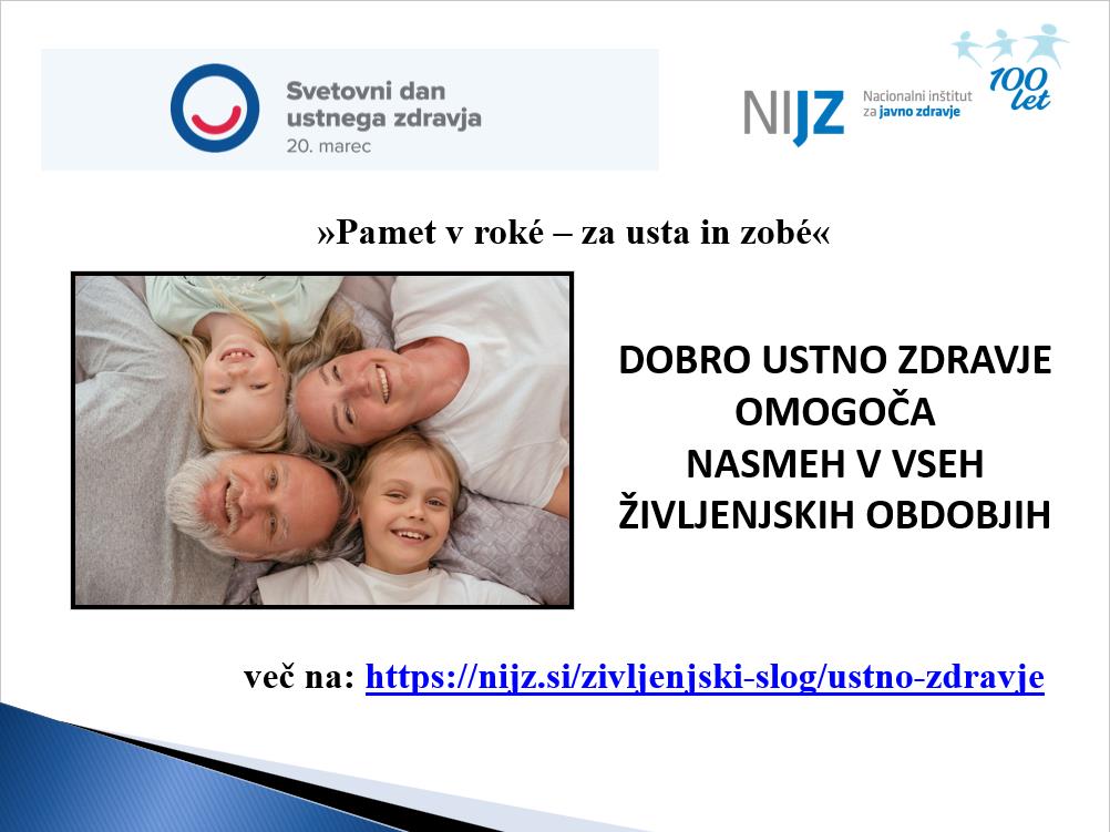 Letošnji slogan svetovnega dneva ustnega zdravja »Dobro ustno zdravje omogoča nasmeh v vseh življenjskih obdobjih« se osredotoča na povezovanje vseh dejavnikov, ki vplivajo na zdravje ustne votline in dobro počutje človeka pri vsaki starosti.