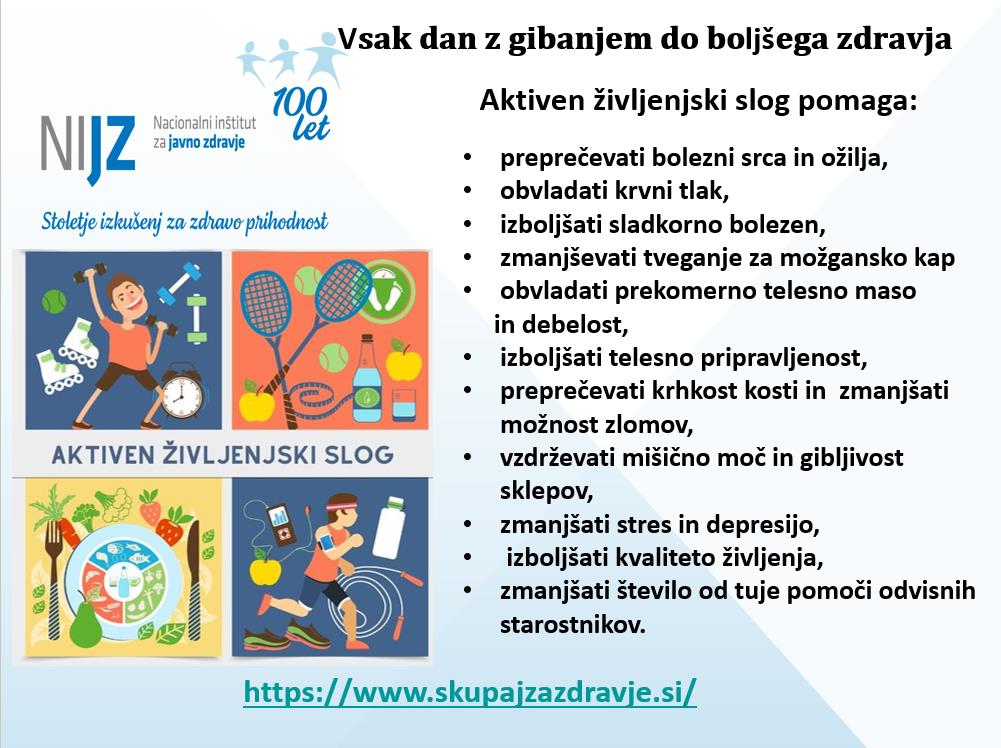 Naše telo je ustvarjeno za gibanje, zato redna telesna dejavnost predstavlja enega izmed temeljev zdravega življenjskega sloga. Dandanes, ko je sedeč življenjski slog vse bolj razširjen, se posledice upada telesne dejavnosti na človeškem organizmu kažejo na najrazličnejše načine.Za zdravje potrebujemo uravnoteženo, varno in učinkovito telesno dejavnost, ki naj bo tudi primerno dozirana – tako glede intenzivnosti, pogostosti, raznovrstnosti, kot tudi glede trajanja same dejavnosti.