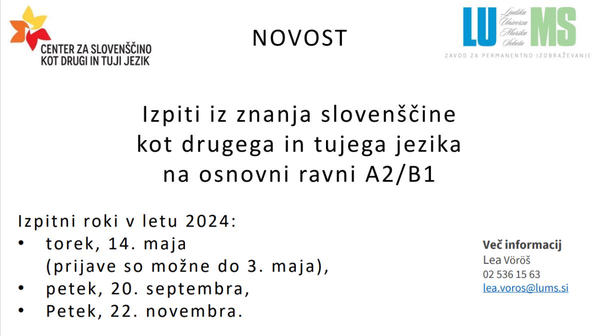 Obvestilo o izpitih iz slovenskega jezika na osnovni ravni v Murski Soboti