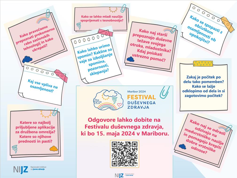 Za udeležbo na predavanjih in delavnicah na 2. Festivalu duševnega zdravja, ki bo 15. maja 2024, od 10. do 18 ure, pred stadionom Ljudski vrt v Mariboru, je potrebna predhodna prijava, ki jo lahko opravite na naslednji povezavi. Ali https://anketa.nijz.si/a/0d86da74